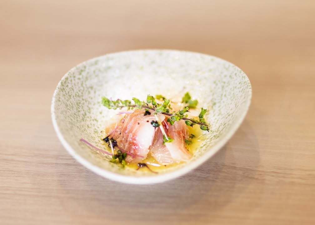 本日のご紹介は、真鯛と三彩カルパッチョ ~柚子と焼きあご出汁の香味ジュレ~。